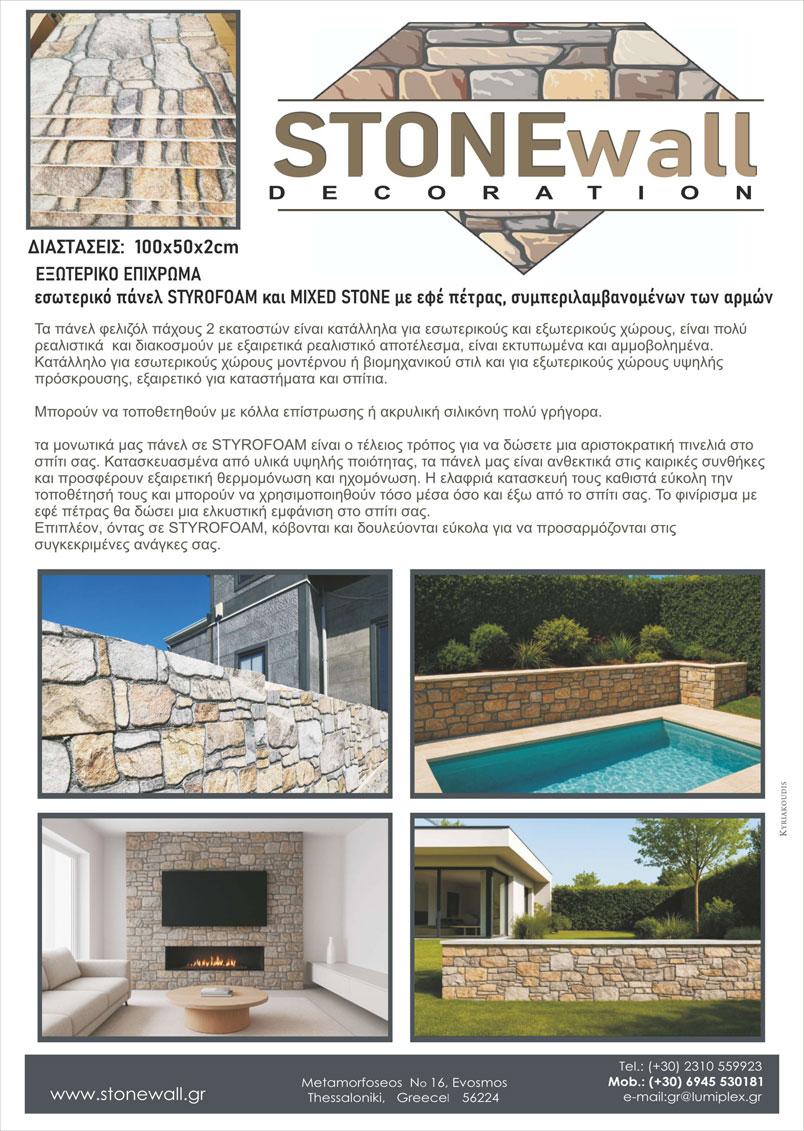 Η σειρά STONEWALL της Kyriakoudis Design φέρνει μια επανάσταση στην κάλυψη επιφανειών με τα Πάνελ Φελιζόλ με όψη πέτρας. Το νέο αυτό brand συνδυάζει αισθητική, λειτουργικότητα και πρακτικότητα, προσφέροντας ρεαλιστική όψη πέτρας με εύκολη τοποθέτηση και υψηλή αντοχή.